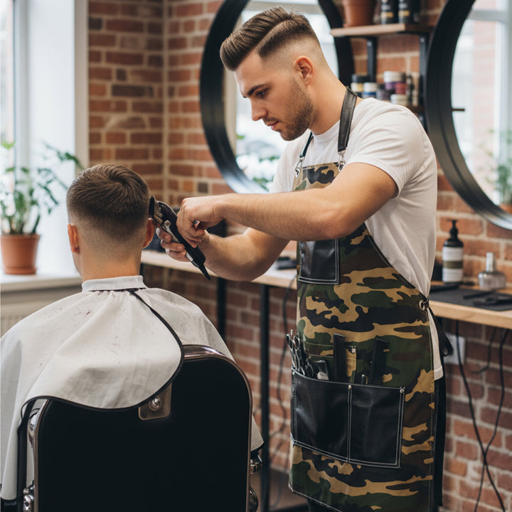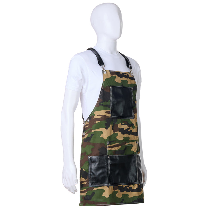 Introducing our premium Tactical Camouflage Apron, a versatile and durable garment designed for professionals who demand both style and functionality. This high-performance apron features an authentic military-inspired camouflage pattern combined with premium black leather accents, creating a bold statement piece that stands out in any environment. The rugged construction offers maximum protection while the tactical design provides practical utility for barbers, chefs, bartenders, and craftsmen alike.