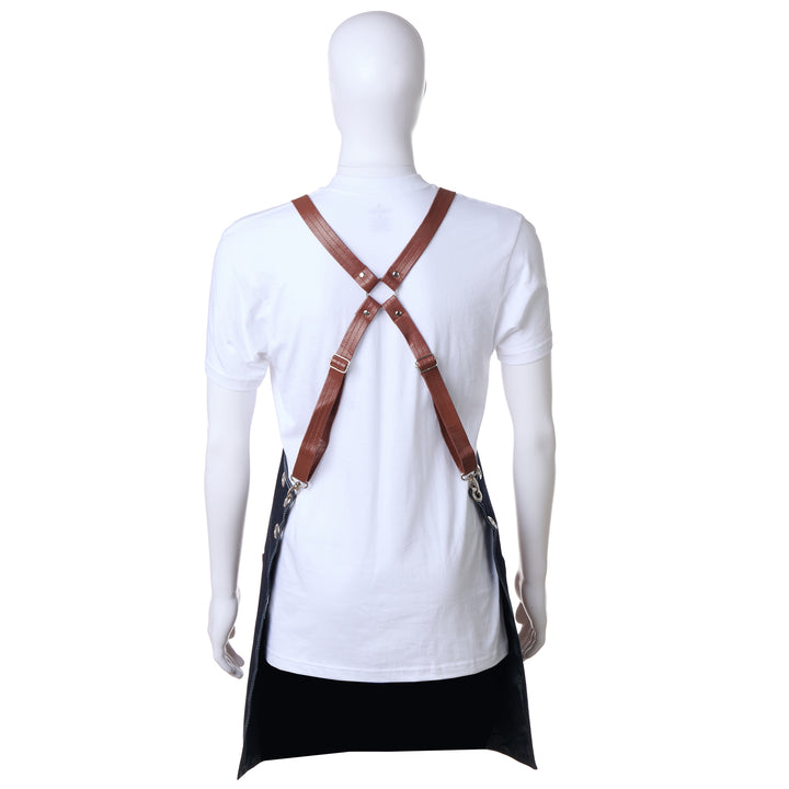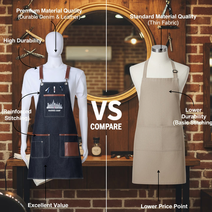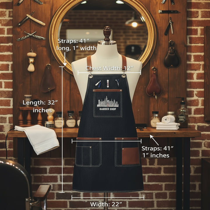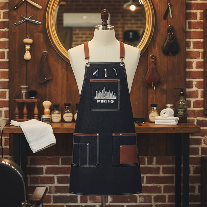 The Professional Barber Shop Denim Apron represents the perfect blend of style, functionality, and durability for today's modern barbers or hairstylists. Crafted from premium denim fabric with rich brown leather accents, this apron embodies the classic barbershop aesthetic while incorporating contemporary design elements.