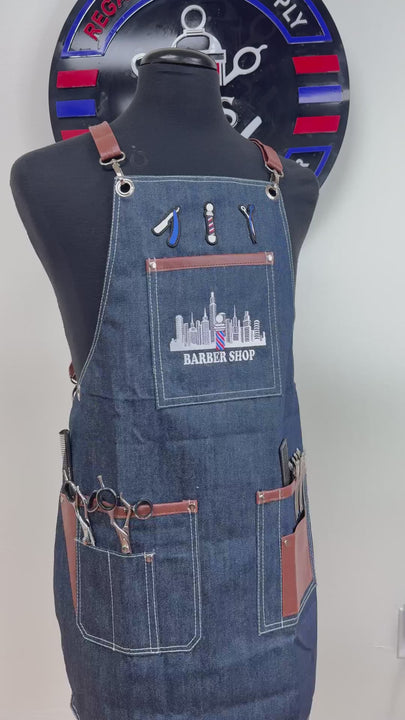 Professional Barber Apron – Blue Denim & Leather Straps
