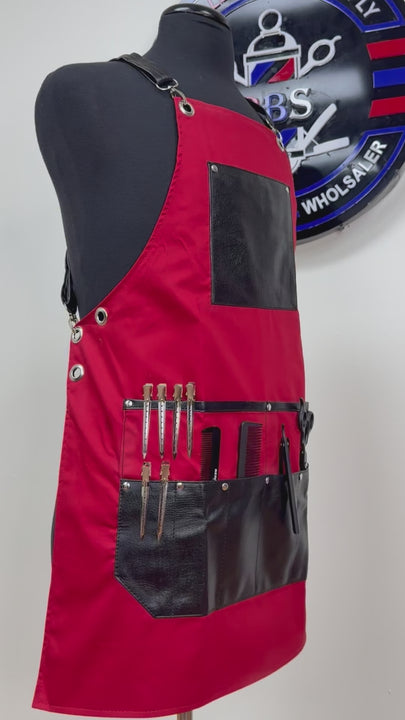 Elevate your craft with our professional-grade work apron, meticulously designed for durability, comfort, and style. Whether you're a barber, chef, artist, or craftsman, this versatile apron is built to handle the demands of your profession while keeping you looking sharp. The striking red cotton body is paired with premium black leather (or high-quality synthetic leather) accents, creating a modern and sophisticated look. The adjustable cross-back strap design ensures all-day comfort by distributing weight evenly across your shoulders, eliminating the neck strain common with standard aprons. With multiple pockets and tool slots, you'll have everything you need right at your fingertips, allowing you to work more efficiently and stay organized. Reinforced with metal rivets and featuring robust construction, this apron is an essential tool for any serious professional.